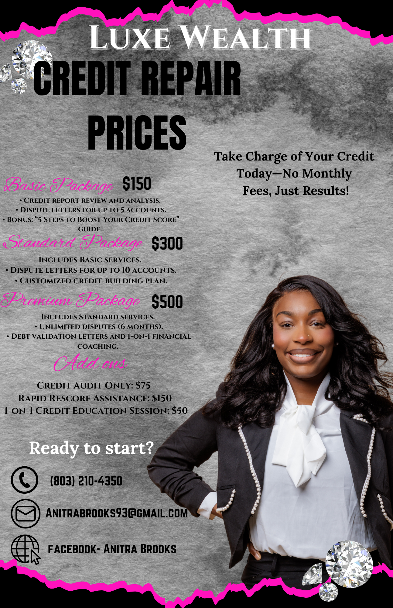 Basic Package ($150) is ideal for clients just starting to repair their credit and includes a full credit report review with personalized analysis, dispute letters for up to 5 accounts, and our bonus “5 Steps to Boost Your Credit Score” ebook. Clients receive clear, actionable steps to begin improving their credit score immediately.